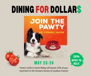Dining for Dollar$ is a delicious way to raise money, awareness and support for animals in need! Foster’s Grille will generously donate 20% of sales to the Humane Society of Loudoun County. So, mark your calendar and come support the at-risk cats and dogs in our community!