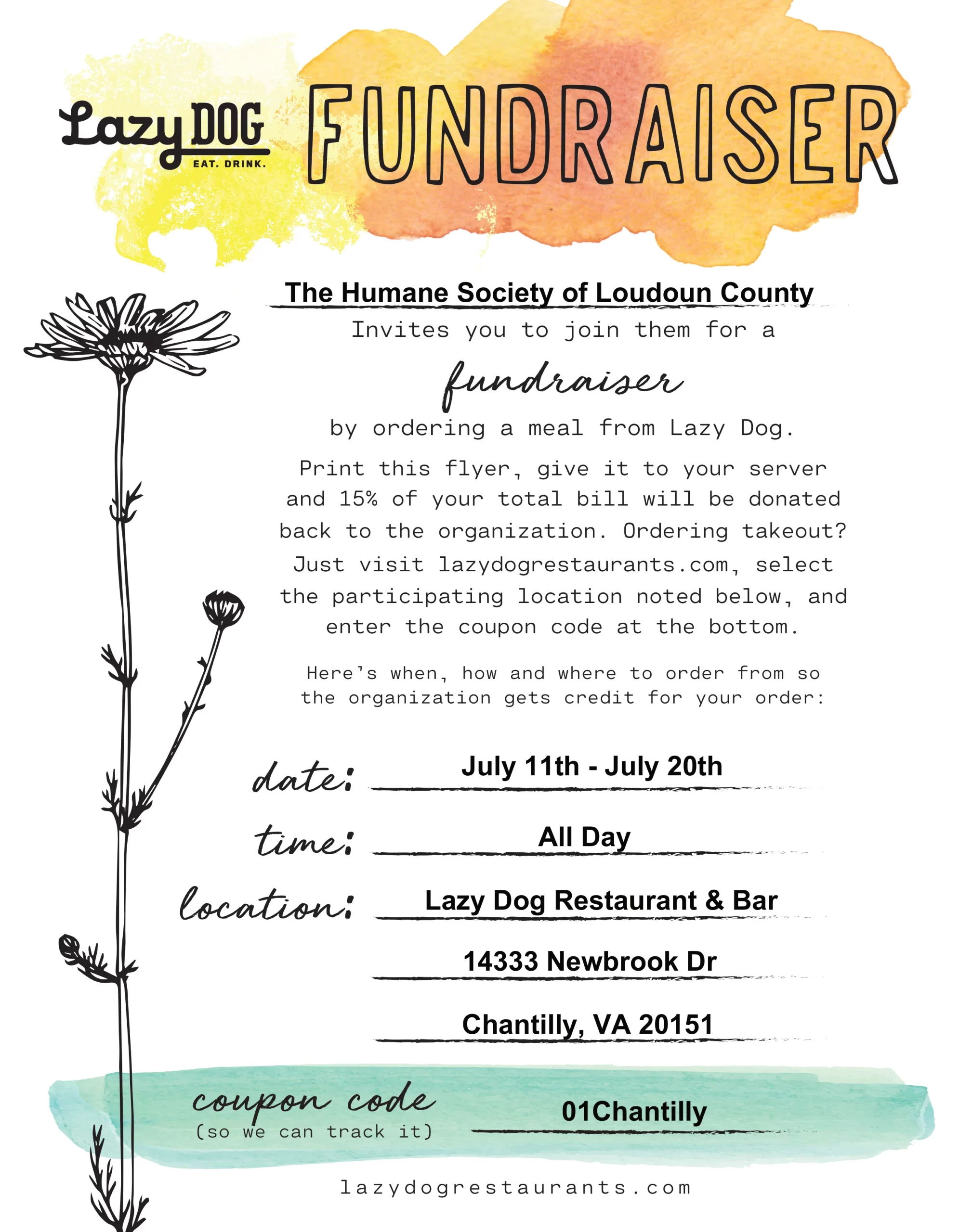 The Humane Society of Loudoun County invites you to join us for a fundraiser at the very PUP-ular restaurant, Lazy Dog in Chantilly. You can help at-risk animals simply by ordering a delicious meal any time from July 11th to July 20th. Print this flyer (or take a screenshot), give it to your server, and […]