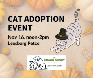 HSLC has many cats and kitties hoping to find their furr-ever families. Come meet them at the Petco in Leesburg from noon to 2pm on Sunday, November 16. For a sneak peek of our adoptable animals, please visit the Humane Society of Loudoun County website!