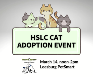 HSLC has many cats and kitties hoping to find their furr-ever families. Come meet them at the PetSmart in Leesburg from noon to 2pm on Saturday, March 14. For a sneak peek of our adoptable animals, please visit the Humane Society of Loudoun County website!