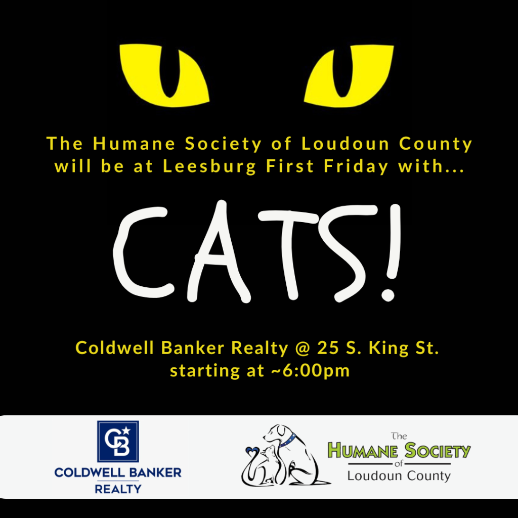 The Humane Society of Loudoun County will be bringing adoptable cats to Leesburg First Friday on August 1. Be sure to come inside and see the kitties up close and in purr-son at Coldwell Banker Realty!