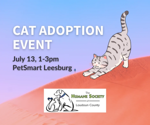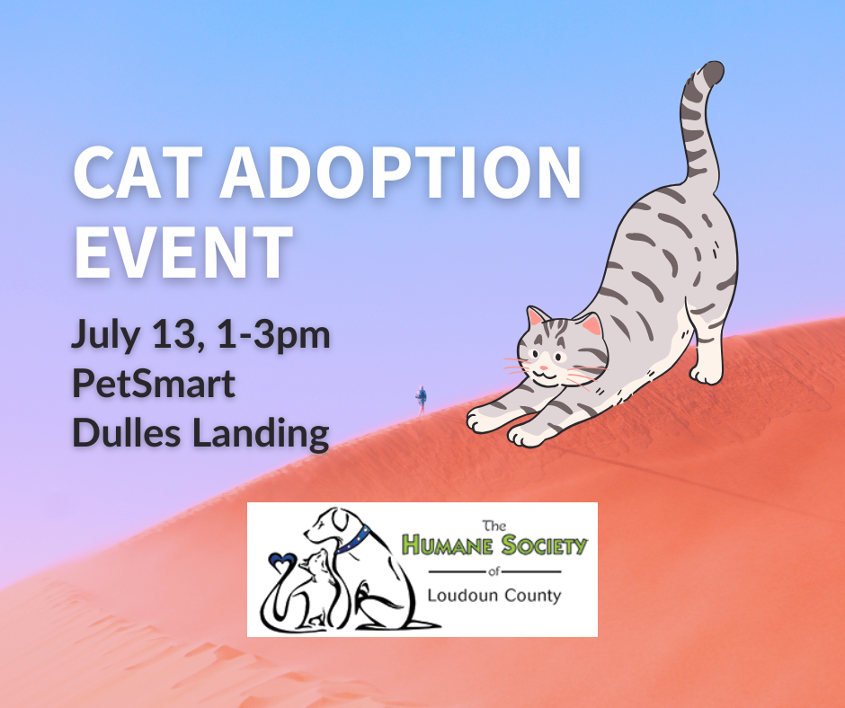 Looking for your next furry family member? We have many cats and kitties hoping to find their fur-ever homes! Come meet them at the PetSmart in Dulles Landing from 1:00pm to 3:00pm on July 13. For a sneak peek of our adoptable animals, please visit the Humane Society of Loudoun County website!