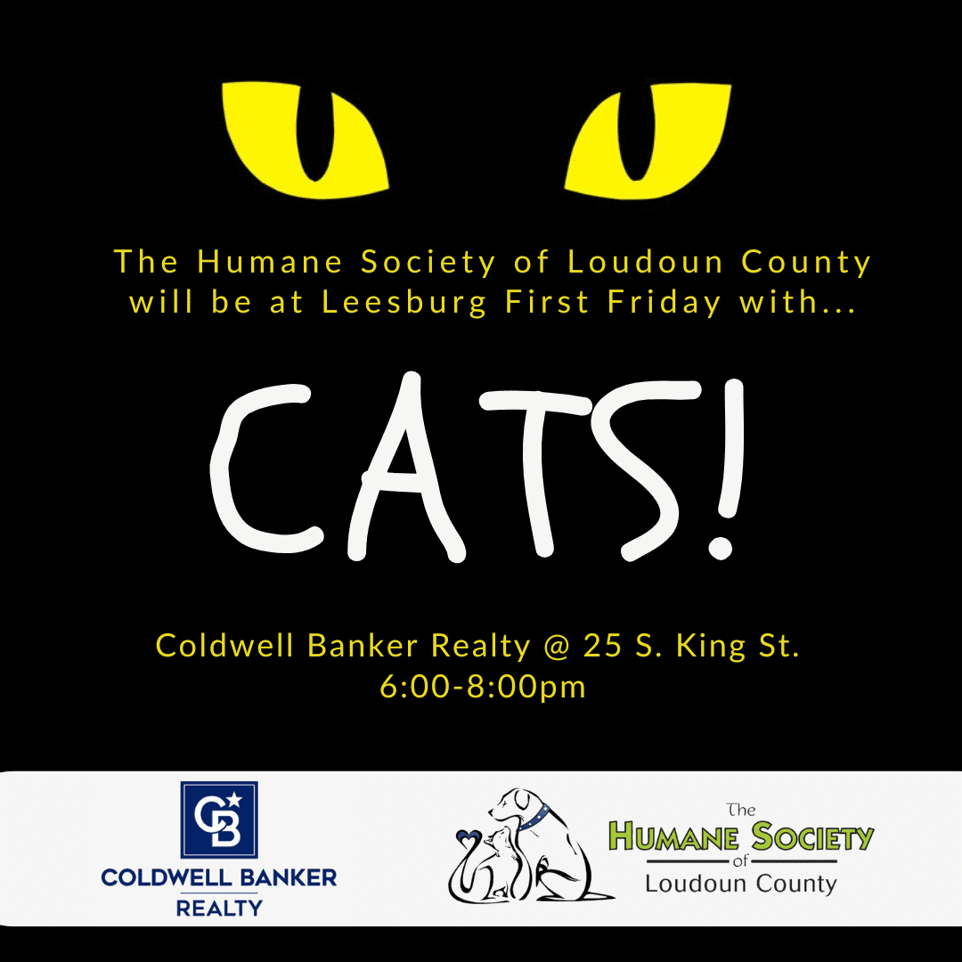 The Humane Society of Loudoun County will be bringing adoptable cats to Leesburg First Friday on October 3. Be sure to come inside and see the kitties up close and in purr-son at Coldwell Banker Realty!